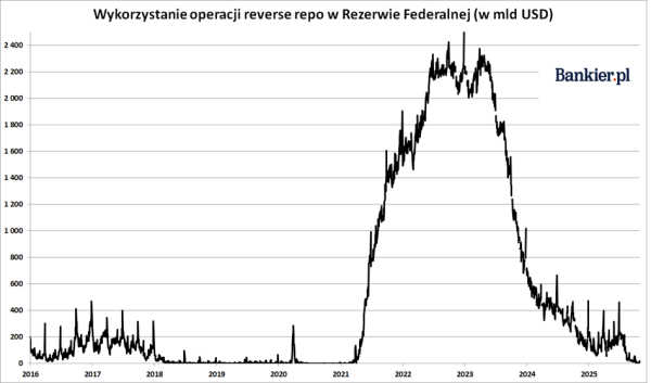 To rutynowa operacja, w której bank centralny przyjmuje od banków komercyjnych gotówkę, obniżając płynność w systemie finansowym. Z perspektywy banku jest to więc krótkoterminowa (mowa tu o operacji jednodniowej – O/N) lokata założona w banku centralnym. W apogeum nadpłynności sektora bankowego w USA we wrześniu 2022 roku wartość tych operacji sięgała nawet 2,4 biliona dolarów. Był to symptom kryzysu nadmiernej płynności. Teraz spadała w okolice zera.