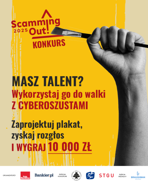 Czy wiesz, że każdego roku oszuści internetowi wyłudzają od obywateli Polski ponad 500 milionów złotych? To poważne niebezpieczeństwo, a Ty możesz dołożyć swoją cegiełkę w zwalczaniu go. Zgłoś się do konkursu na projekt plakatu w ramach kampanii informacyjno-edukacyjnej „Scamming Out – Powstrzymaj internetowych naciągaczy”.