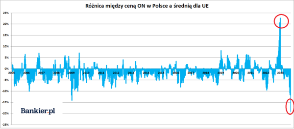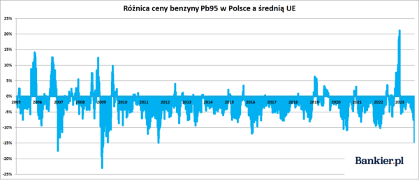 Według najnowszych dostępnych danych (tj. z 11 września) 1000 litrów benzyny PB95 kosztowało w Polsce równowartość 764,13 euro (licząc bez podatków). W Czechach było to 819,86€, w Niemczech 908,19€, a średnia unijna wyniosła 896,25€. Zatem benzyna w Polsce była o 6,8% tańsza niż w Czechach (gdzie Orlen także posiada rafinerie) i była aż o 14,7% tańsza niż średnio w UE. Jest to więc różnica bardzo istotna, ale jeszcze nie rekordowa, ponieważ zdarzały się krótkotrwałe „wahnięcia” nawet na -20%. W latach 2005-23 benzyna była w Polsce przeciętnie o 3% tańsza od średniej unijnej (liczonej bez podatków!).