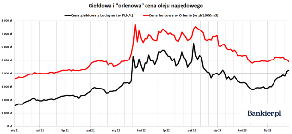 Jeszcze dziwniejsza sytuacja ma miejsce w przypadku oleju napędowego, który w czwartkowym cenniku płockiej rafinerii figurował po cenie 4 897 zł/m3, co daje ok. 6,02 zł/l brutto. Także w tym przypadku jest to najniższa stawka od wybuchu wojny w Ukrainie. Jest to tym bardziej dziwne, że tona oleju napędowego na londyńskiej giełdzie wyceniana jest teraz na blisko tysiąc dolarów, czyli o ponad 40% wyżej niż pod koniec czerwca. Tymczasem Orlen sprzedaje to paliwo nawet ciut taniej niż na początku wakacji. Coś tu więc nie gra.