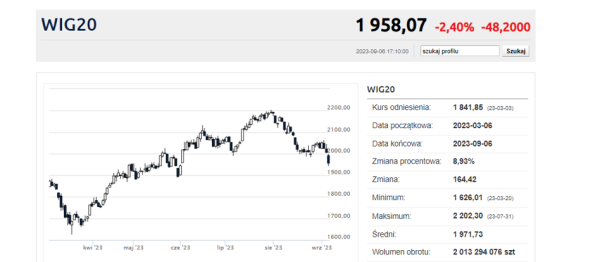Jeszcze przed południem w środę WIG20 tracił ponad 2,6 proc. i spadł do 1951,26 pkt – najniżej od 1 czerwca br. WIG tracił ok. 2 proc., a mWIG40 i sWIG80 spadały chwilę przed południem o odpowiednio 2,3 proc. i 1,1 proc.