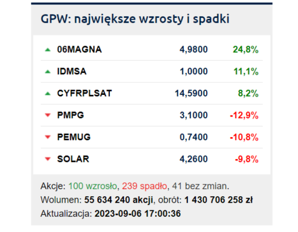 W niższych segmentach rynku nowe historyczne dno osiągnął kurs Kernela (-8,44 proc.), ale jego kapitalizacja jest największa od czasu wybuchu wojny. Wszystko przez nową emisję akcji. Mocno oberwały akcje energetycznych Enei (-6,65 proc.) i Tauronu (-6,32 proc.). Wzrostami poza CCC drugi dzień z rzędu wyróżnił się Mabion (4,66 proc.).