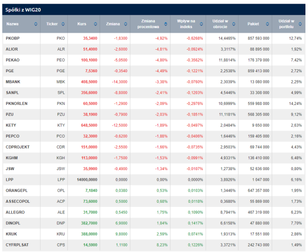 Poniżej notowania spółek wchodzących w skład WIG20 po zakończeniu sesji: