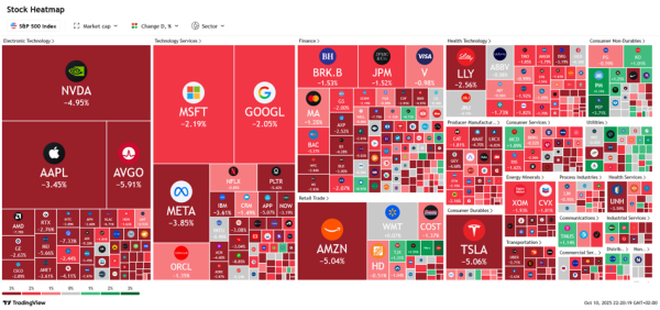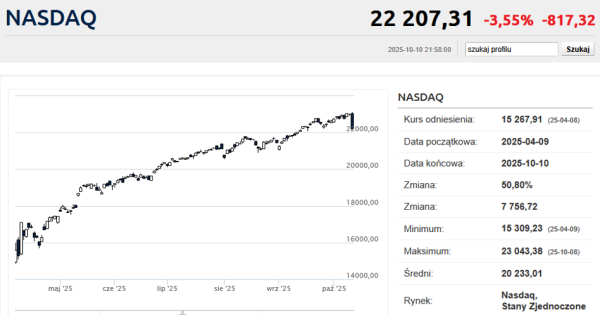 I zaczęły tracić. W piątekS&P500 stracił 2,71%, schodząc do poziomu 6 552,50 pkt. Był to najsilniejszy dzienny spadek od kwietnia. Nasdaq Composite odnotował obniżenie aż o 3,56% i kończył tydzień na poziomie 22 204,43 pkt. Również w tym przypadku była to najgorsza sesja od blisko pół roku. Dow Jones zniżkował o1,88%, zatrzymując się na progu 45 787,09 pkt.
