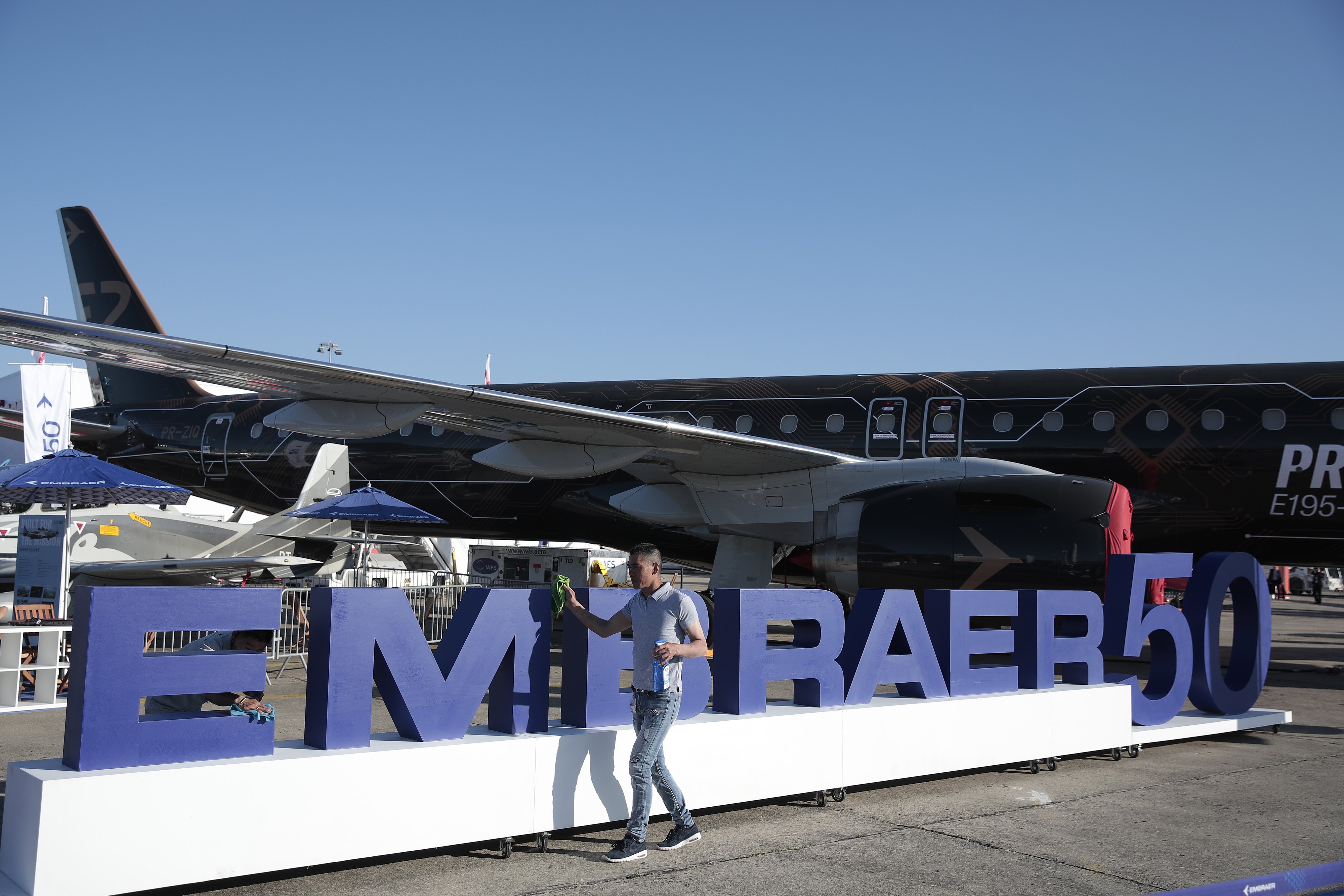 Embraer 195-E2 podczas 55. odsłony Międzynarodowego Salonu Lotniczego w Paryżu na lotnisku Paryż-Le Bourget na północ od Paryża